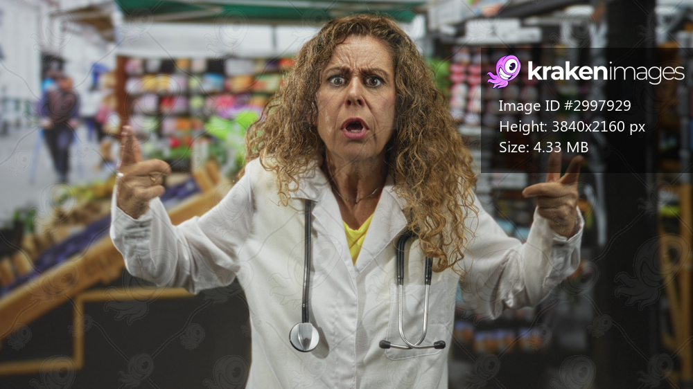 Woman doctor with stethoscope points fingers to chest in supermarket produce aisle building; frustration health concern.