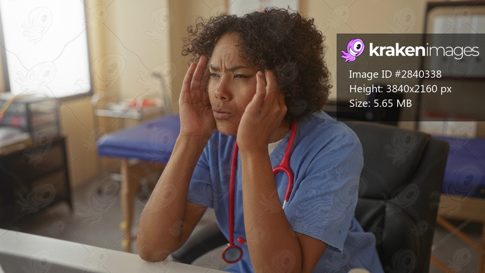 Woman doctor with stethoscope presses temple gesture while seated at desk in clinic room; physical exhaustion.