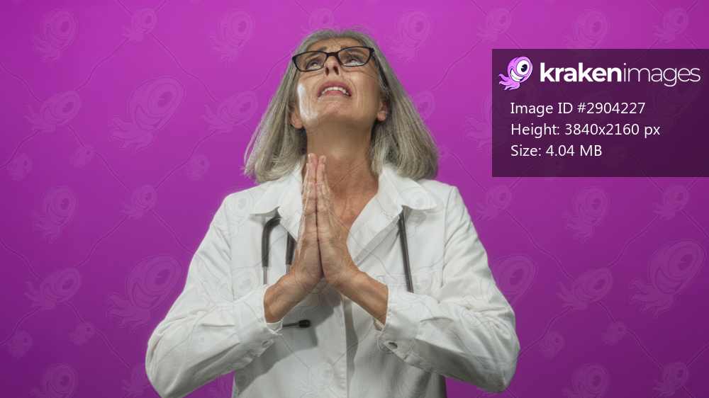 Woman doctor with stethoscope pressing hands together in prayer gesture in purple studio; hope compassion recovery.