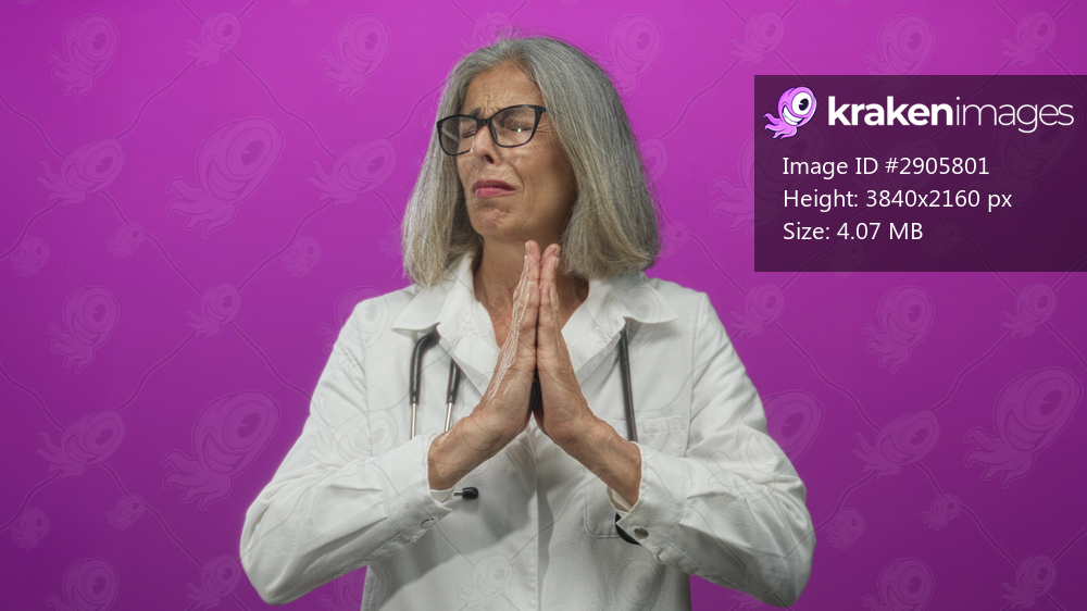Woman doctor with stethoscope pressing hands together in prayer gesture in purple studio; hope compassion recovery.