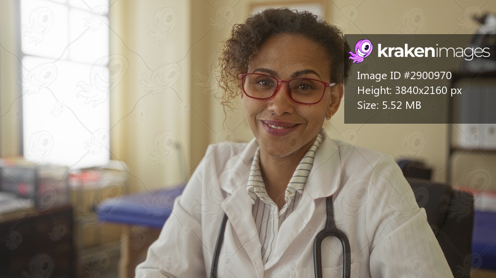 Woman doctor with stethoscope reviewing patient notes at clinic desk wearing white coat and red glasses, looking focused and attentive; compassion care trust. - Kraken Images