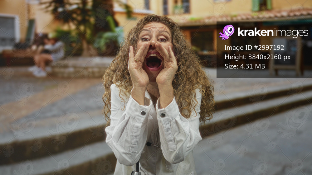 Woman doctor with stethoscope shouting, hands cupped to mouth on a cobbled street plaza near cafe steps; joy celebration.