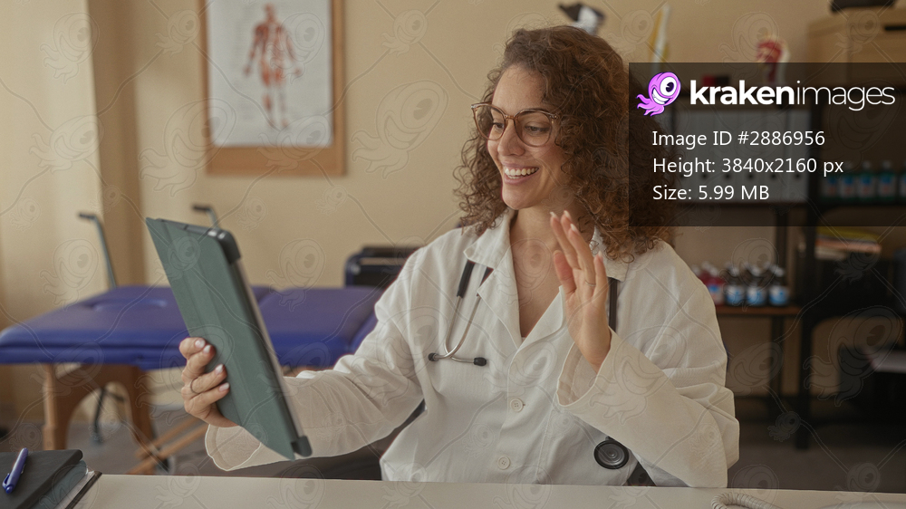 Woman doctor with stethoscope smiling and waving hand while holding tablet in building clinic exam room; compassion telemedicine.
