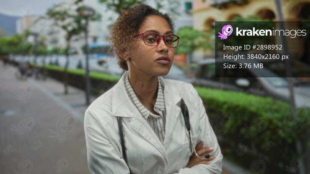 Woman doctor with stethoscope standing with arms crossed on street lined with hedges and parked cars; professionalism confidence resilience.
