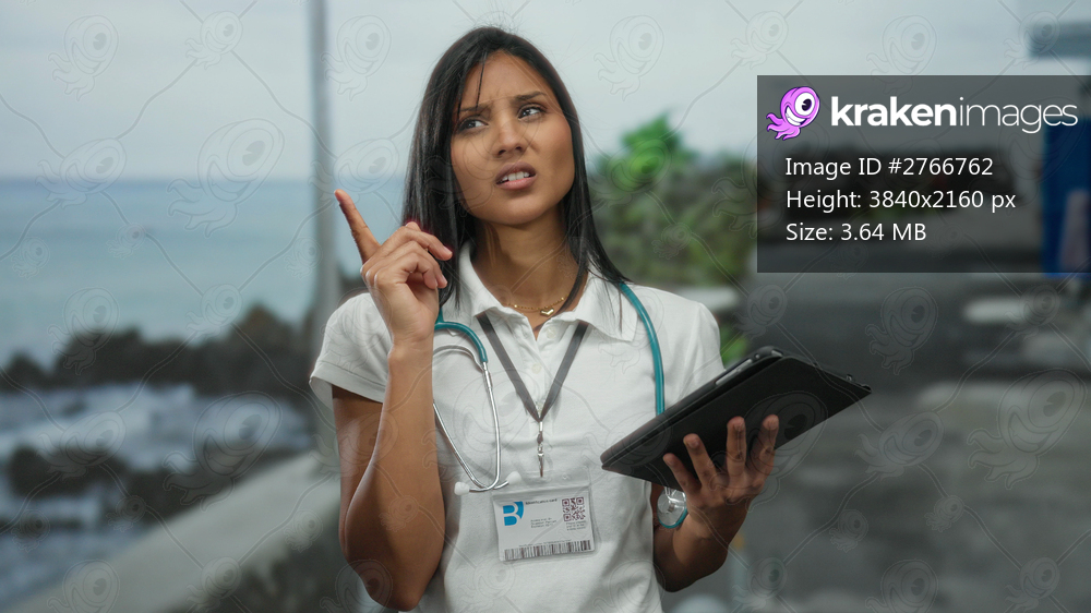 Woman doctor with stethoscope and tablet thinking on seaside promenade with calm sea in background representing medical consultation in outdoor setting - Kraken Images