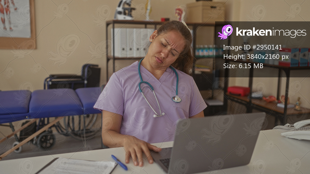 Woman doctor with stethoscope tilts head back exposing neck at clinic desk with laptop and telephone; fatigue burnout resilience.