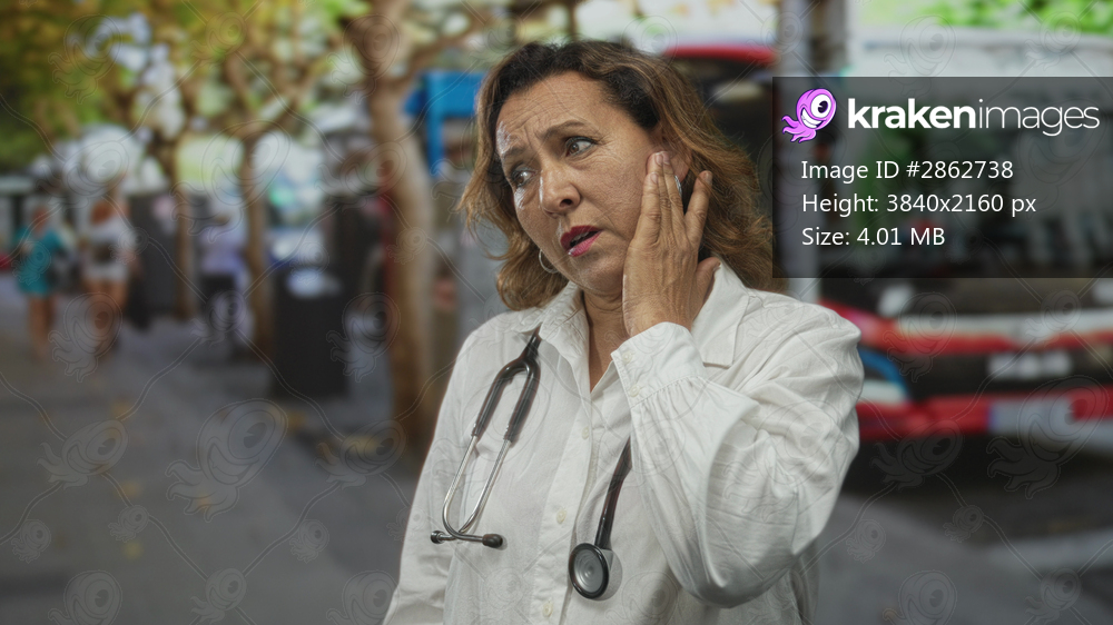 Woman doctor with stethoscope touches ear in crowded city street showcasing medical professional on duty; concern.