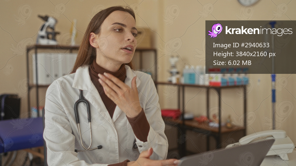 Woman doctor with stethoscope touching chest and gesturing at laptop while seated at clinic desk with medical shelf; compassionate care.