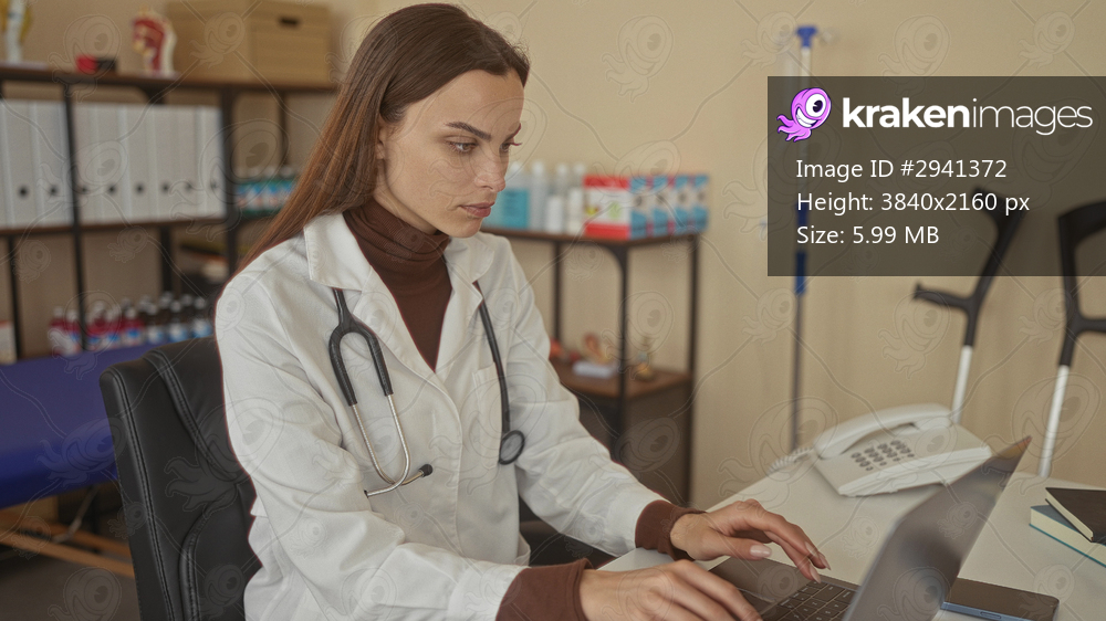 Woman doctor with stethoscope typing on laptop in clinic building at her desk; focused care efficiency.