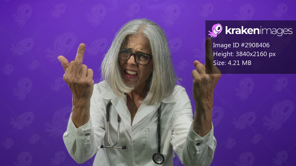 Woman doctor with stethoscope and white coat showing both middle fingers in studio purple set; anger defiance.