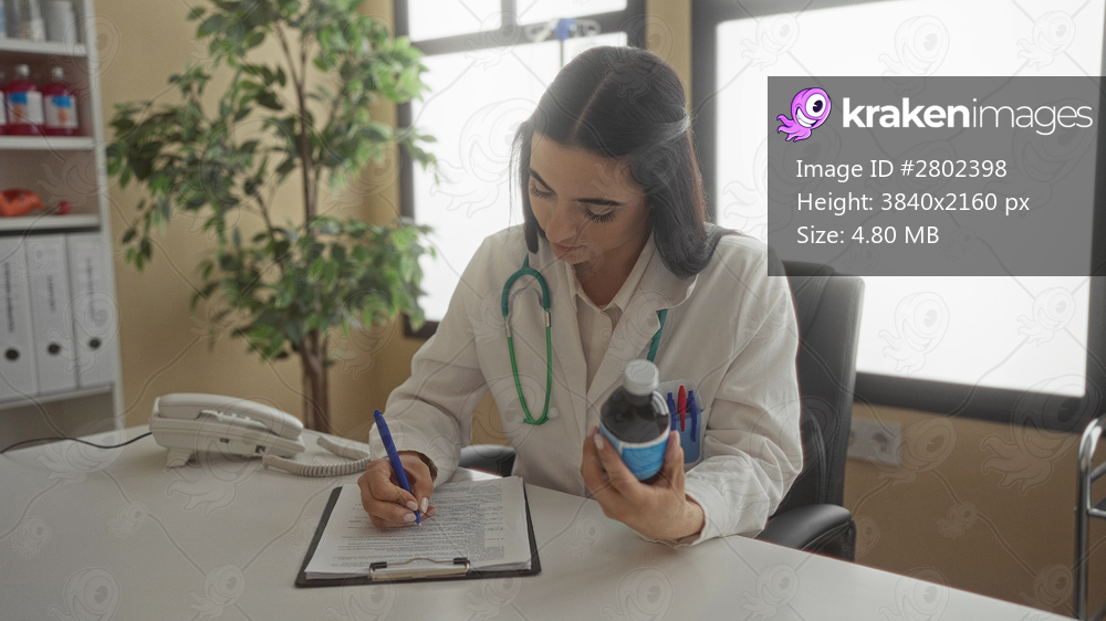 Woman doctor with stethoscope writing notes in a clinic holding medication bottle in a well-lit office environment showcasing medical professionalism.