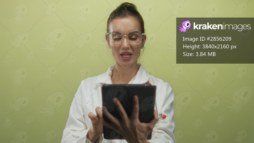 Woman doctor taps tablet and gestures palm with stethoscope in studio; confidence telemedicine innovation health.