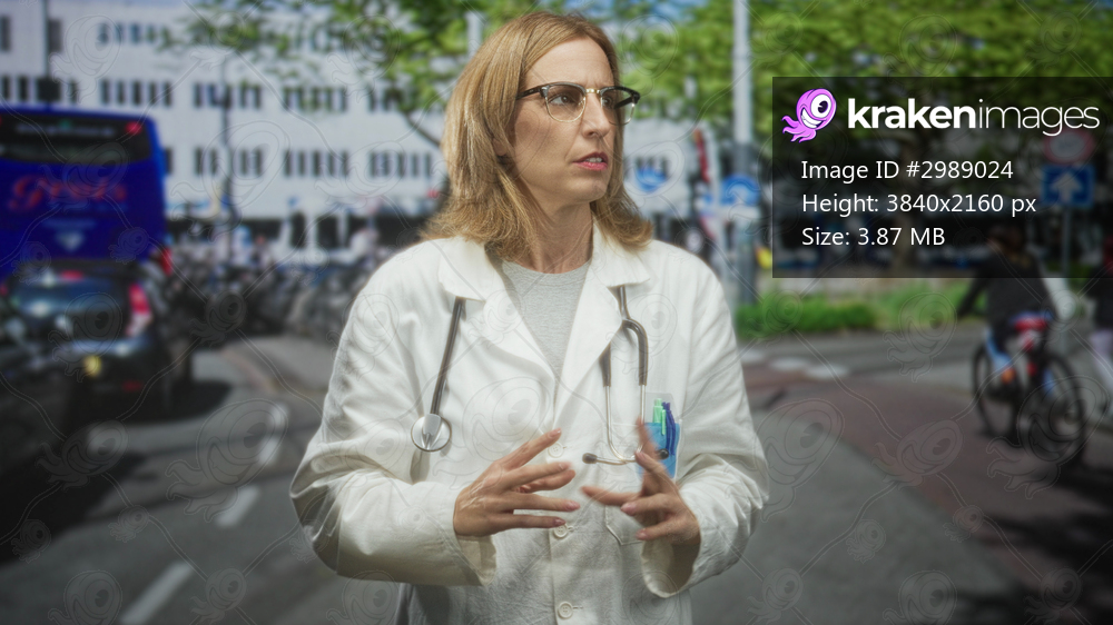 Woman doctor touches her neck and holds a stethoscope at her chest while standing on a busy city street near buses and cars, eyes closed and wincing; dizziness. - Kraken Images