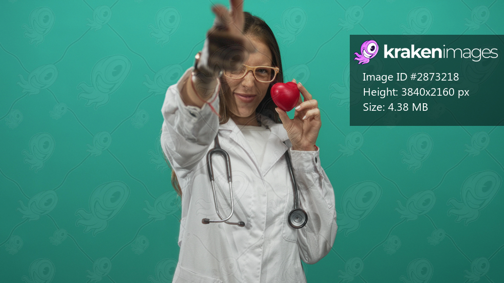 Woman doctor wearing a stethoscope holding a red heart and pointing finger at camera in teal studio; cardiac health confidence.