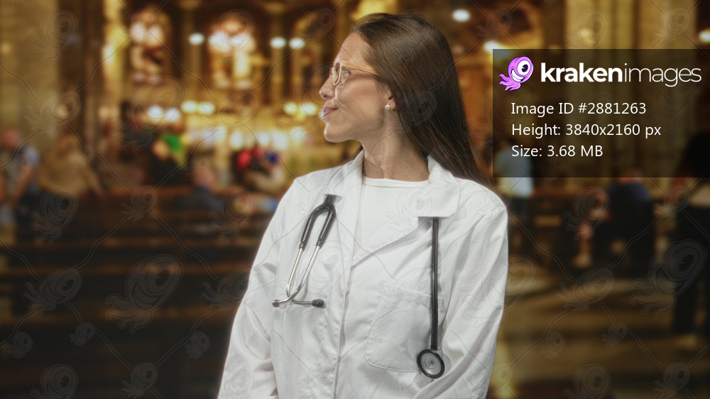Woman doctor wearing a white coat and stethoscope glances to the side inside a church building with pews and warm lights; serenity faith healing.