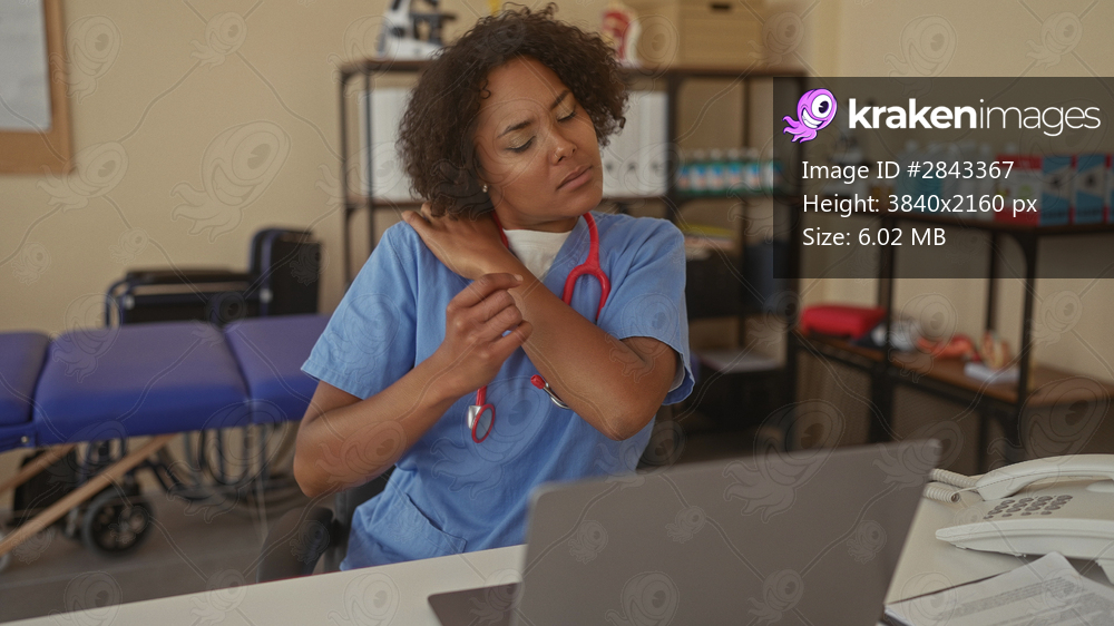 Woman doctor wearing blue scrubs holds neck at desk with laptop and stethoscope in a clinic building office; stress.