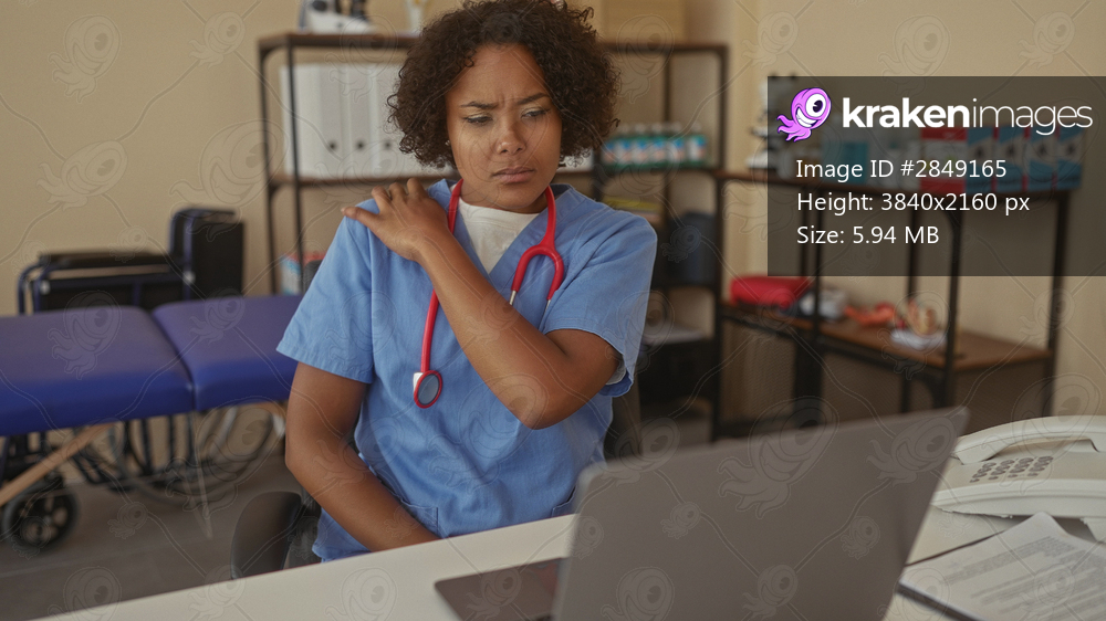 Woman doctor wearing blue scrubs holds neck at desk with laptop and stethoscope in a clinic building office; stress.