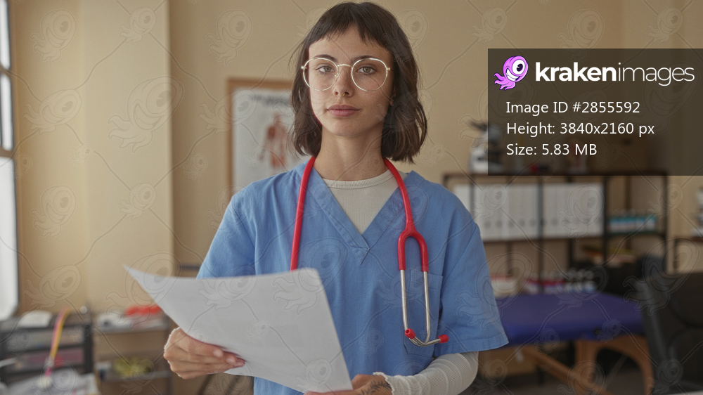 Woman doctor wearing blue scrubs reading paper with hand holding document and stethoscope in clinic building; compassion.