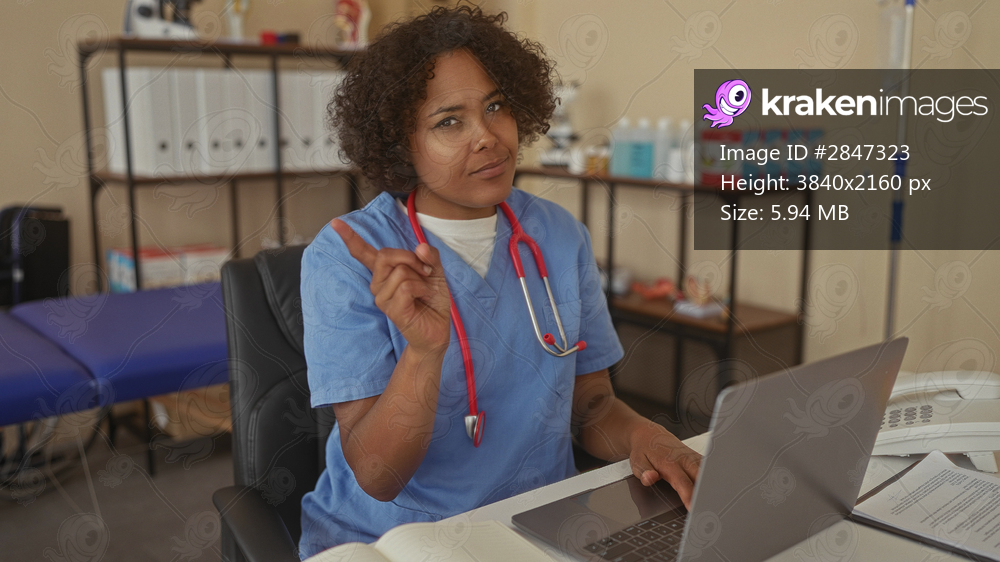 Woman doctor wearing blue scrubs and red stethoscope typing on laptop at desk in clinic; compassion dedication expertise focus.
