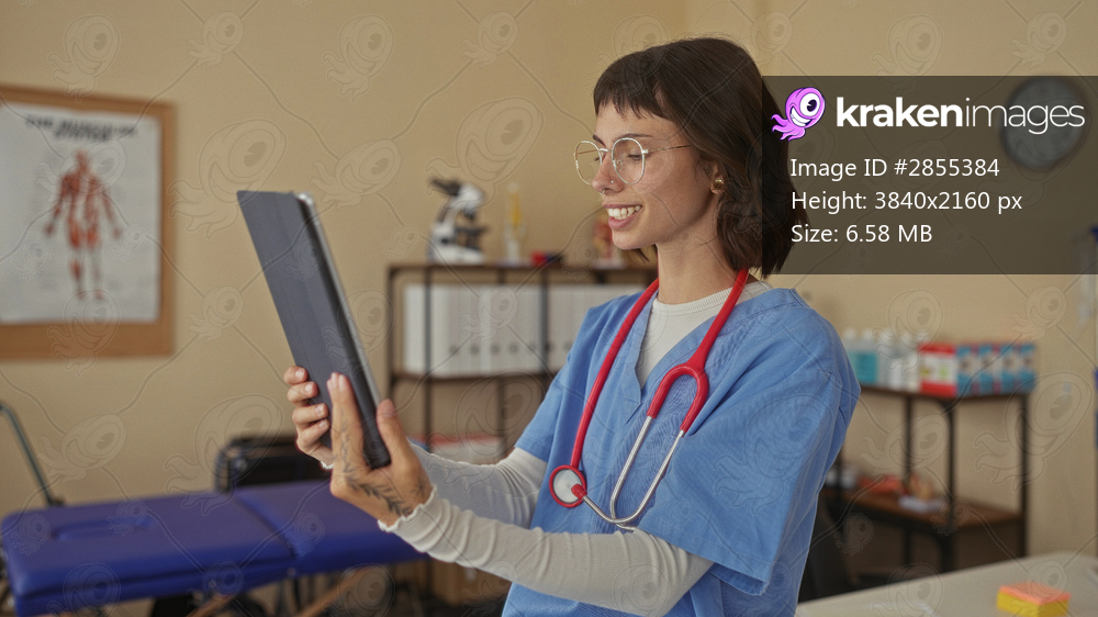 Woman doctor wearing blue scrubs and stethoscope holds tablet and checks patient data in clinic; confidence care.
