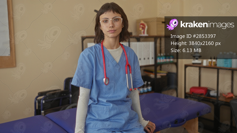 Woman doctor wearing glasses and blue scrubs holds red stethoscope with crossed arms in clinic with medical shelves; confidence.