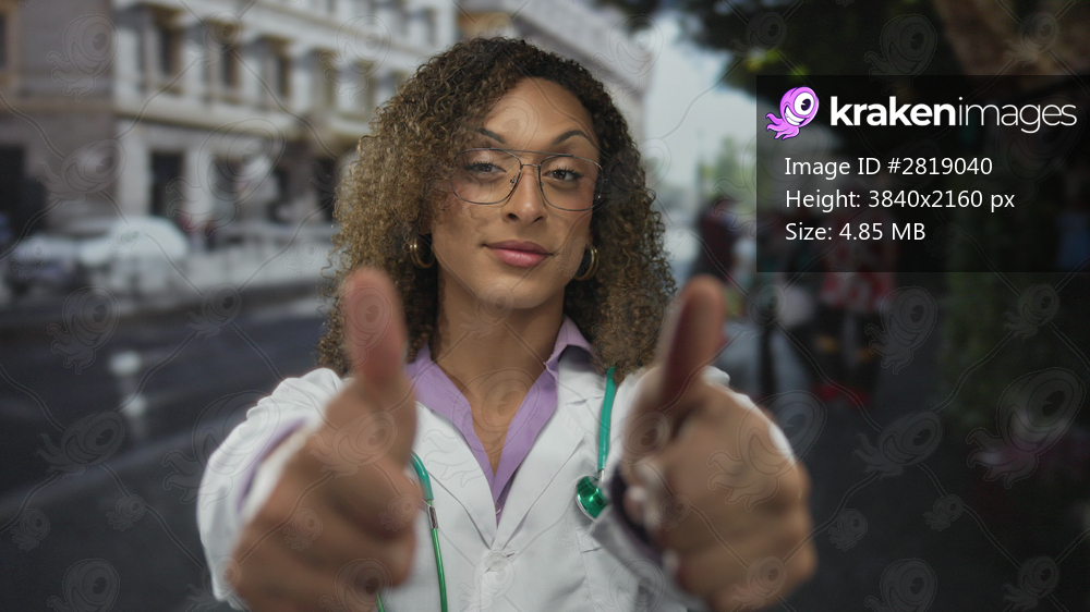 Woman doctor wearing glasses and holding stethoscope gives thumbs up on urban street in city; confidence.