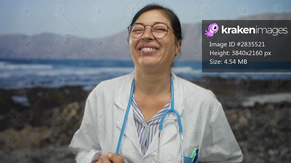 Woman doctor wearing glasses holds a stethoscope and smiles beside a rocky shoreline on a sunny beach; confidence.