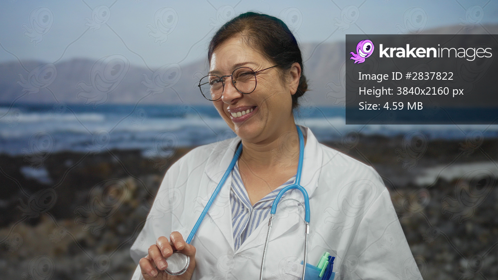 Woman doctor wearing glasses holds a stethoscope and smiles beside a rocky shoreline on a sunny beach; confidence.