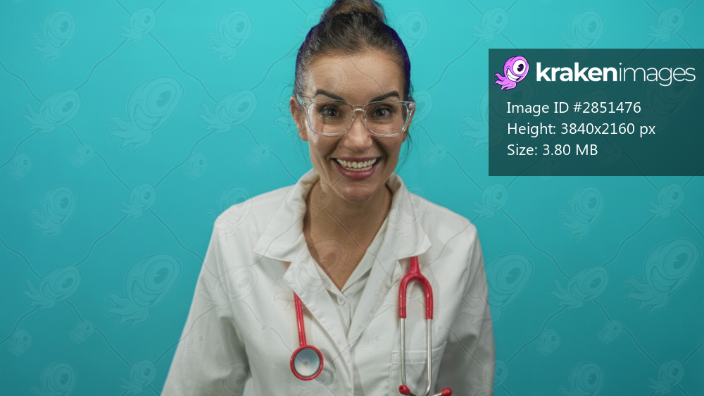 Woman doctor wearing glasses and stethoscope crosses arms in turquoise studio; confidence empowerment.