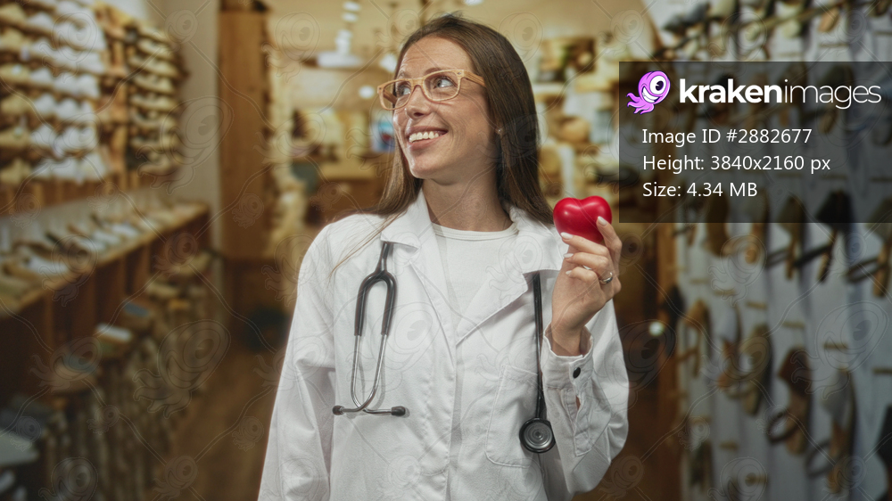 Woman doctor wearing glasses and stethoscope holding red heart in shop building; cardiac care compassion.