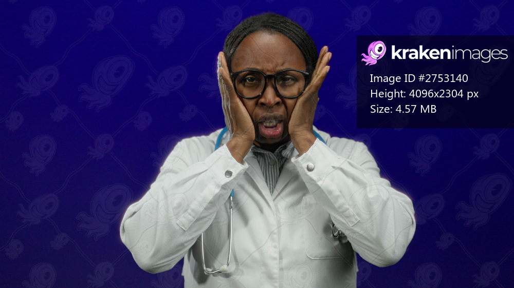 Woman doctor wearing glasses and white coat holds head in stress against blue background medical pressure concept