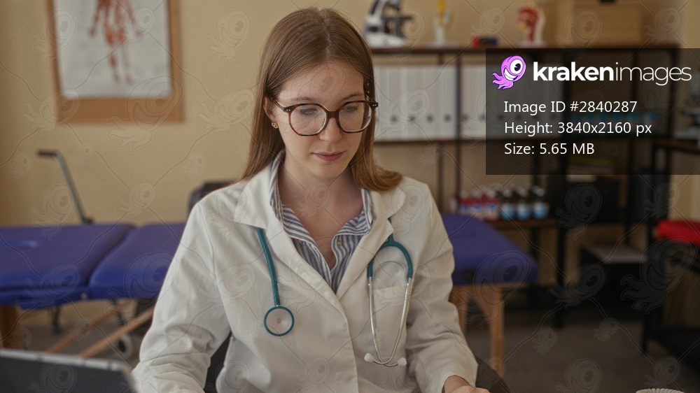 Woman doctor wearing glasses white coat and stethoscope carefully reads medical document on desk in clinic examination room; focused care professionalism dedication. - Kraken Images