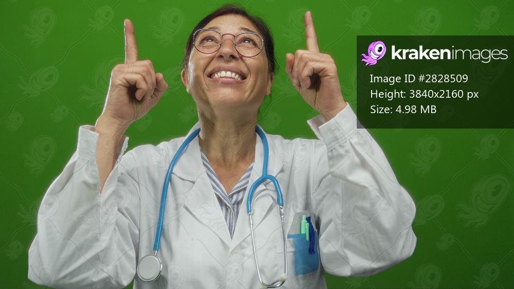 Woman doctor wearing glasses and white coat with stethoscope smiling and pointing finger upward in green studio; healing care hope.