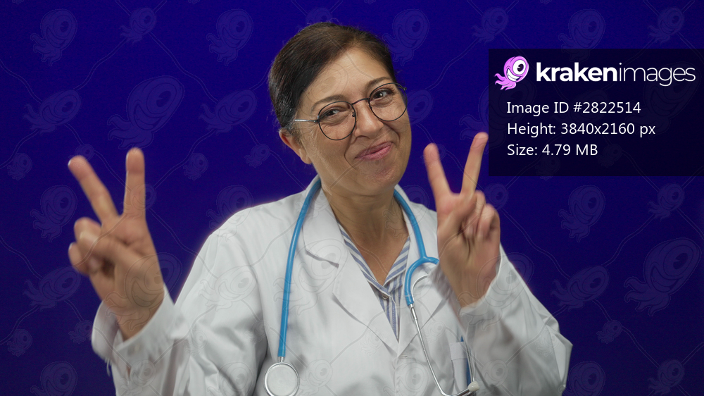 Woman doctor wearing glasses and whitecoat with stethoscope flashing peace sign in blue studio; compassion health optimism care.