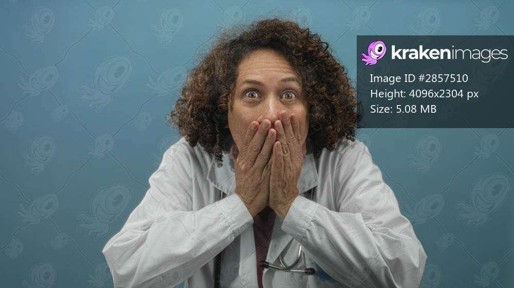 Woman doctor wearing lab coat and stethoscope covers mouth with both hands against pale blue studio wall; surprise.