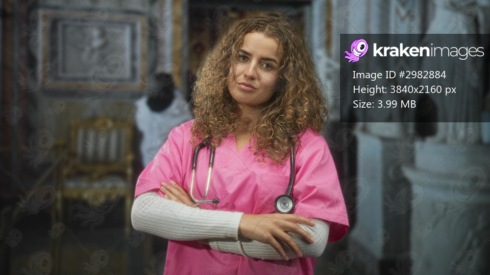 Woman doctor wearing pink scrubs with stethoscope and arms crossed in ornate building; compassion care confidence.