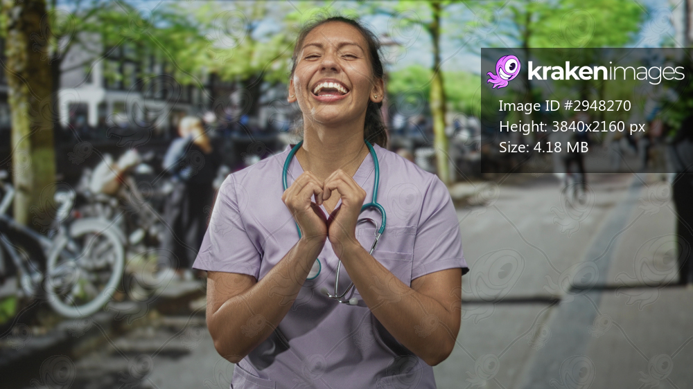 Woman doctor wearing purple scrubs and stethoscope smiling broadly and making heart hand gesture while standing on a busy city street; care community joy. - Kraken Images