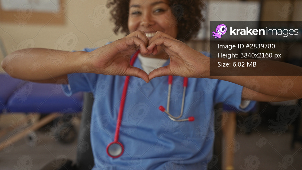 Woman doctor wearing scrubs forms heart hand gesture in clinic room with blurred therapy table behind her; compassion healing.
