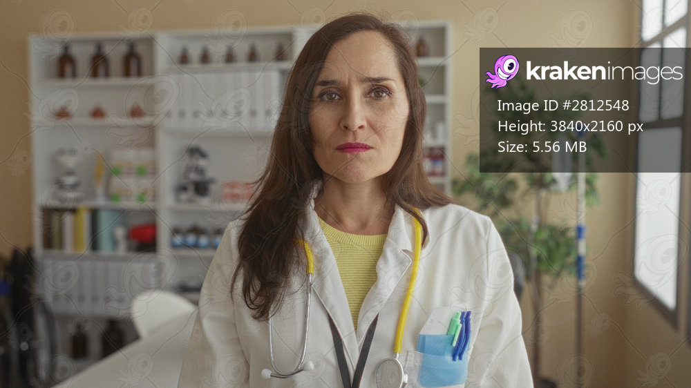 Woman doctor wearing stethoscope in clinic interior speaking professionally in a medical environment with shelves and equipment visible behind her suggesting healthcare setting. - Kraken Images
