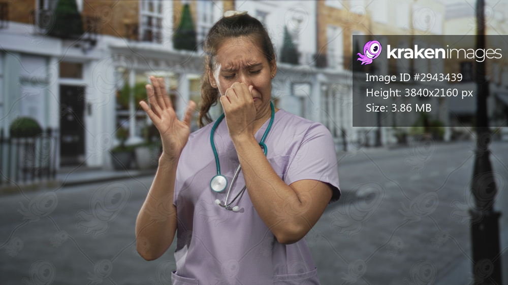 Woman doctor wearing stethoscope pinches nose on city street while waving hand away to block odor; disgust fatigue.
