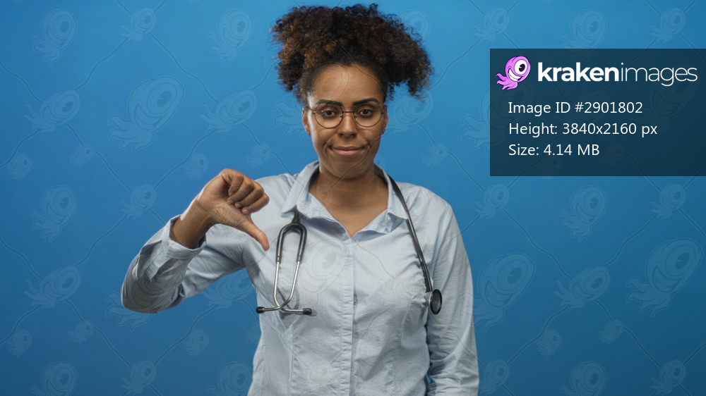 Woman doctor wearing stethoscope shows a thumbs down gesture with visible hand and wrist in a blue studio; disapproval.