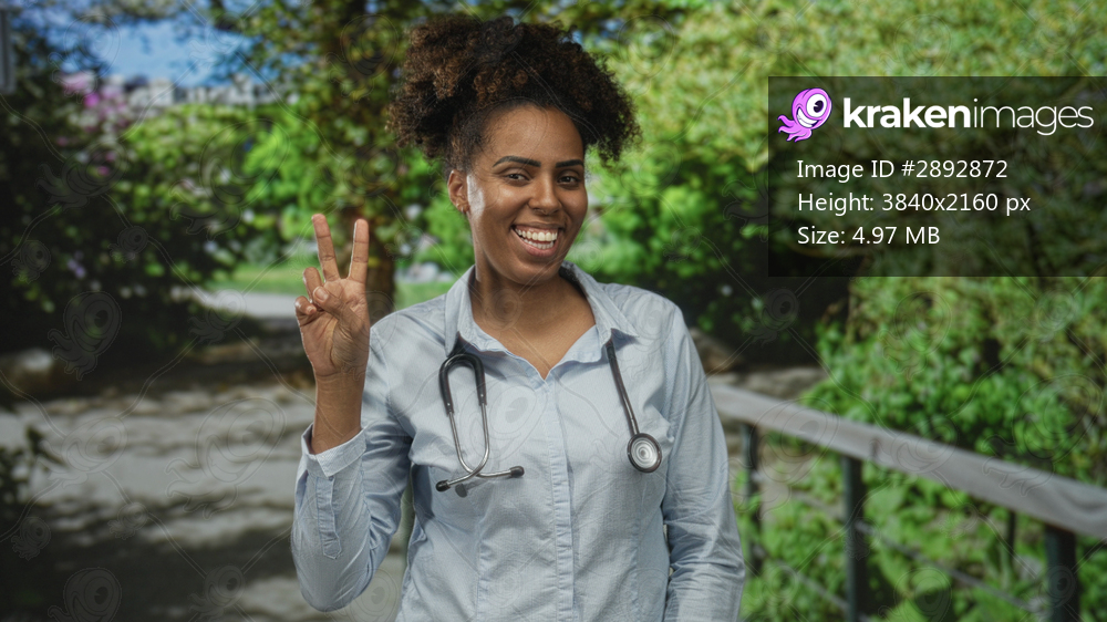 Woman doctor wearing stethoscope smiles and holds up two fingers peace sign in forest; healthcare optimism support.