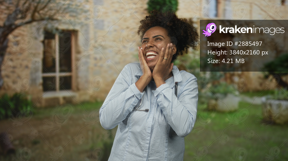Woman doctor wearing stethoscope smiling broadly with hands on cheeks while standing outside in front of stone building entrance; compassion care joy.