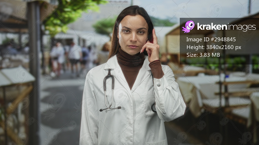 Woman doctor wearing stethoscope standing and facing camera on restaurant terrace outdoors; calm professionalism patient care.