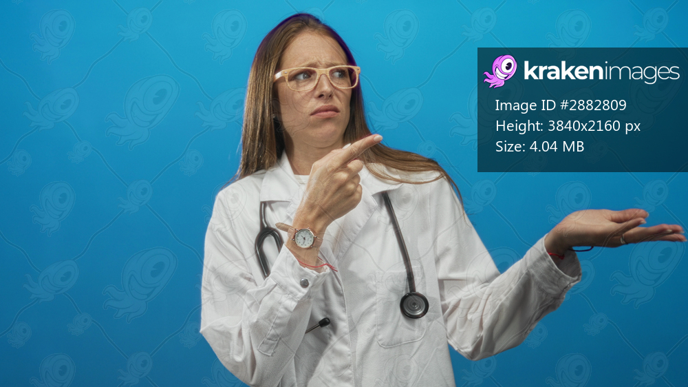 Woman doctor wearing white coat and glasses with stethoscope pointing finger in blue studio, watch on wrist; concern uncertainty.