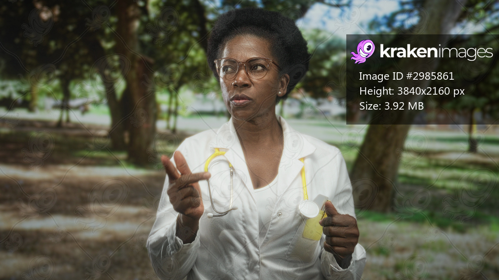 Woman doctor wearing white coat and glasses with yellow stethoscope points finger to palm in forest; clinical empathy concern.