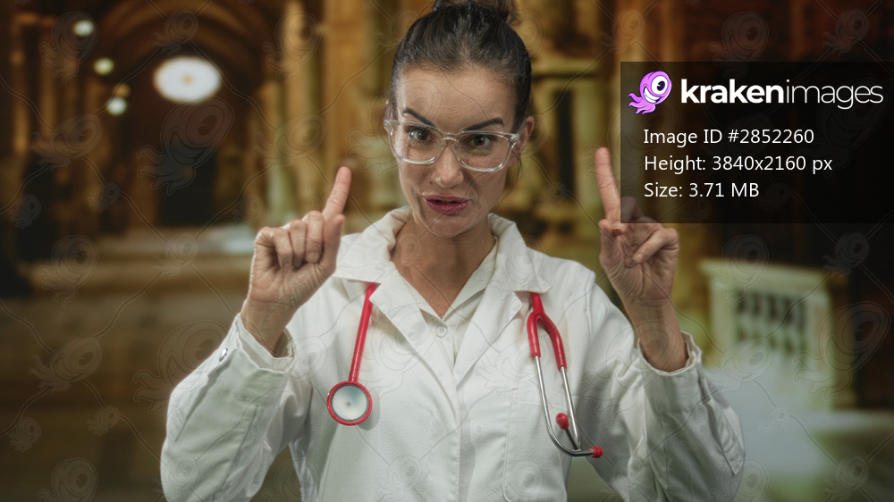 Woman doctor wearing white coat holds red stethoscope and points finger inside building corridor; compassion.