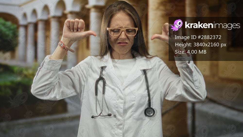 Woman doctor wearing white coat with stethoscope giving double thumbs down gesture in building; medical critique disapproval.