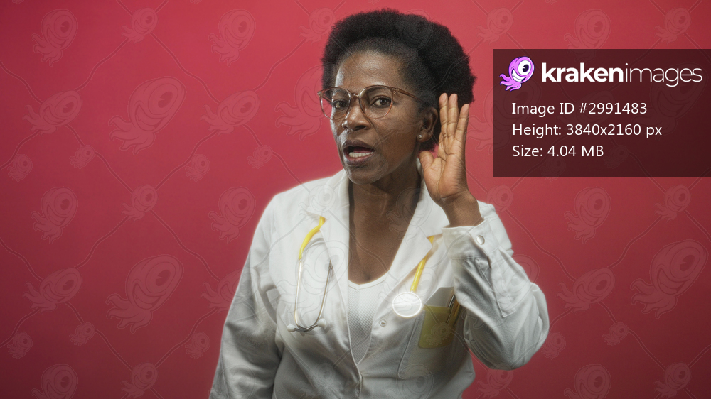 Woman doctor wearing white coat and stethoscope holds hand cupped to ear and raises other hand in studio to indicate listening; attentive listening.