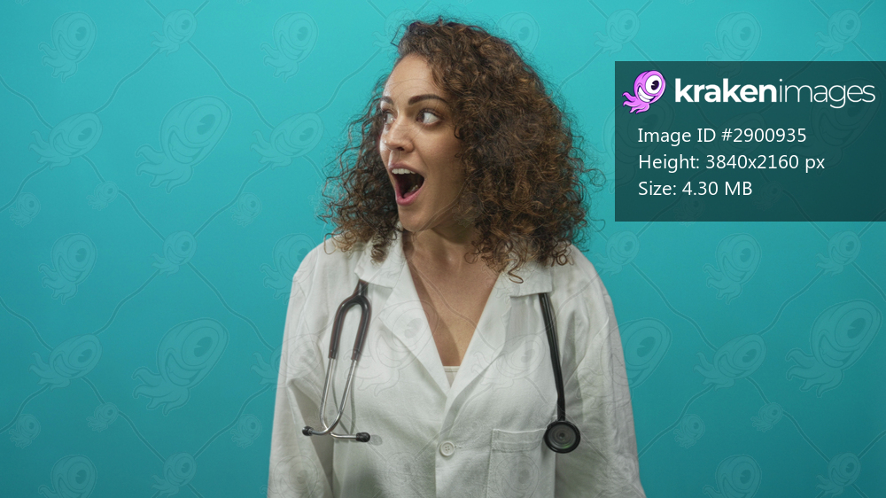 Woman doctor wearing white coat with stethoscope, mouth open and looking to side against turquoise studio wall; surprise.